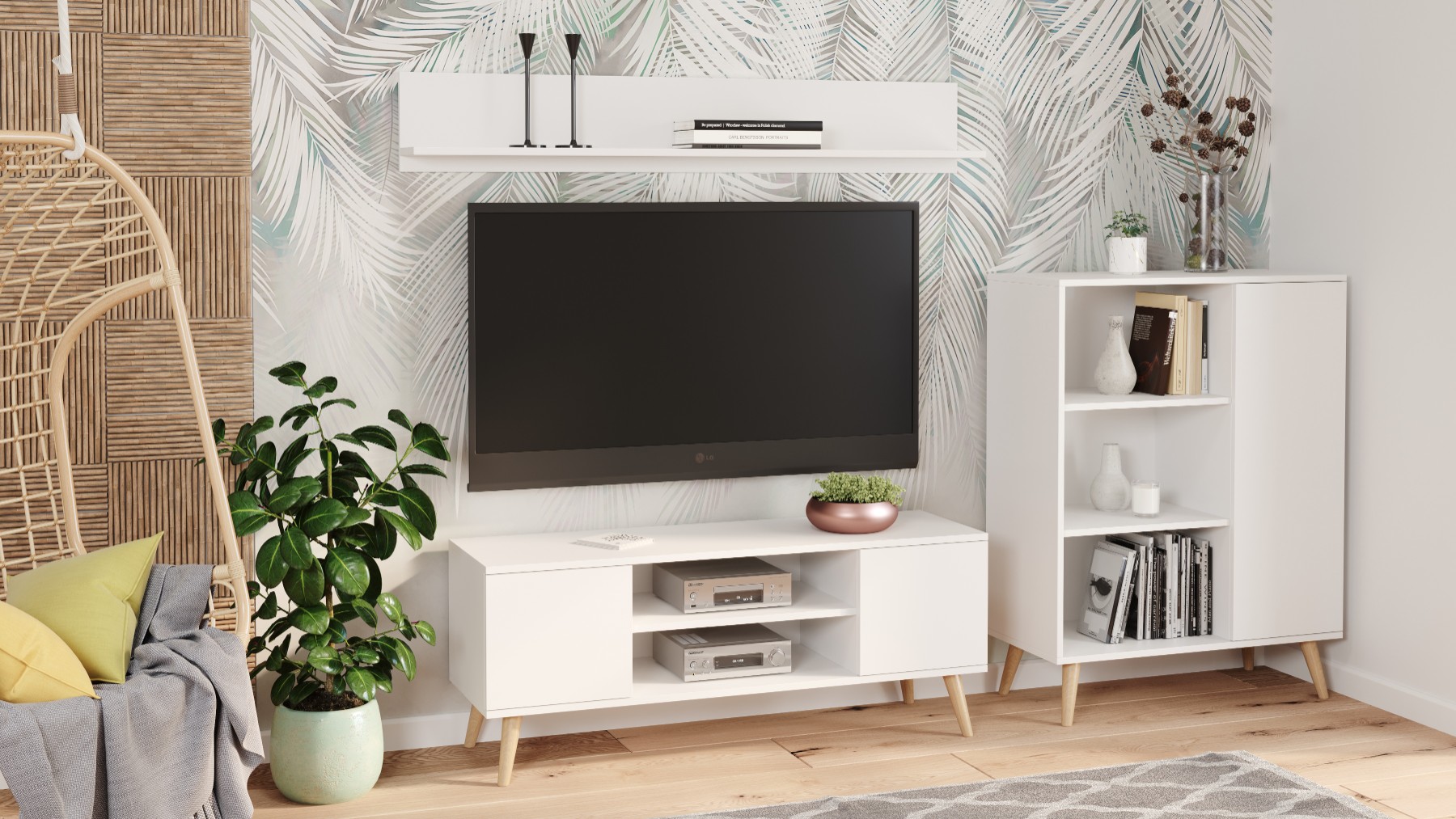- Funkcjonalność i wygoda – pojemne, zamykane szafki doskonałe do przechowywania drobnych przedmiotów, takich jak instrukcje obsługi, piloty czy ulubione filmy.
