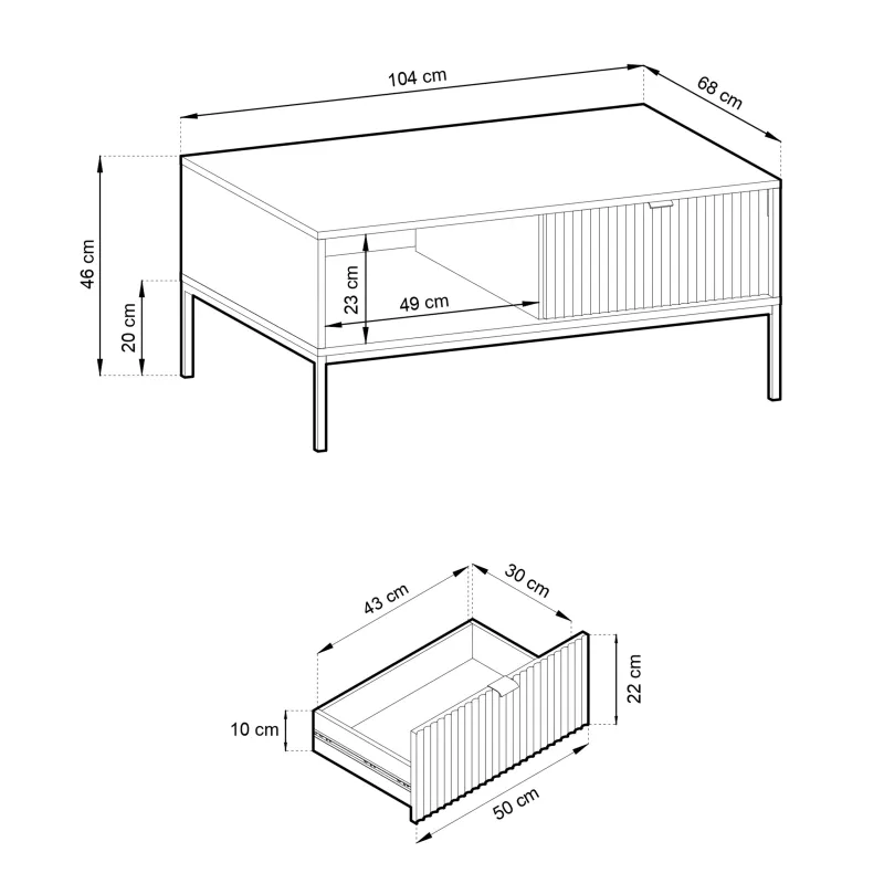 Nowoczesny stolik kawowy Nova to elegancki mebel, który łączy w sobie funkcjonalność i estetykę. Wykonany z wysokiej jakości laminowanej płyty, która jest odporna na zarysowania, gwarantuje długotrwałe użytkowanie. Jego minimalistyczny design sprawia, że doskonale wpisuje się w różnorodne aranżacje wnętrz, niezależnie od stylu. Stolik wyposażony jest w pojemną szufladę, która umożliwia wygodne przechowywanie niezbędnych akcesoriów i drobiazgów w zasięgu ręki. Przestrzeń pod blatem jest idealna do ustawienia książek czy pilotów, co dodatkowo podnosi funkcjonalność mebla. Matowe wykończenie blatu sprzyja stylowemu serwowaniu napojów i przekąsek, a solidne metalowe nóżki zapewniają stabilność. Frezowany front nadaje mu unikalny charakter, co sprawia, że stolik kawowy Nova stanie się wyjątkowym akcentem w Twoim salonie.