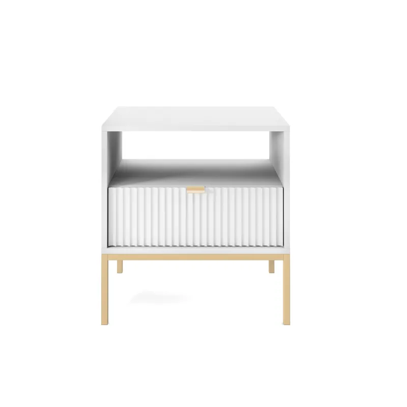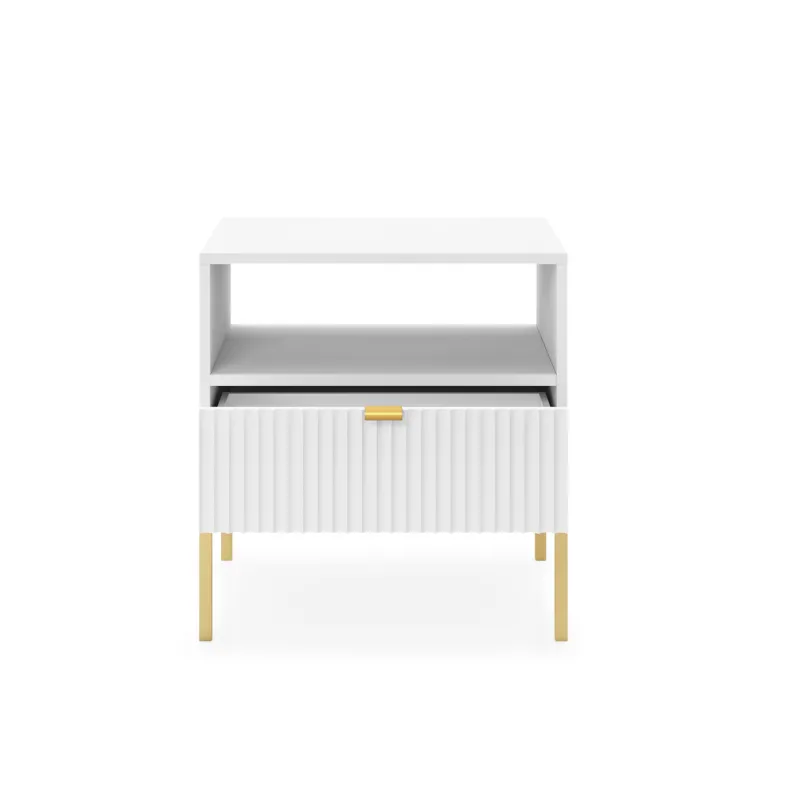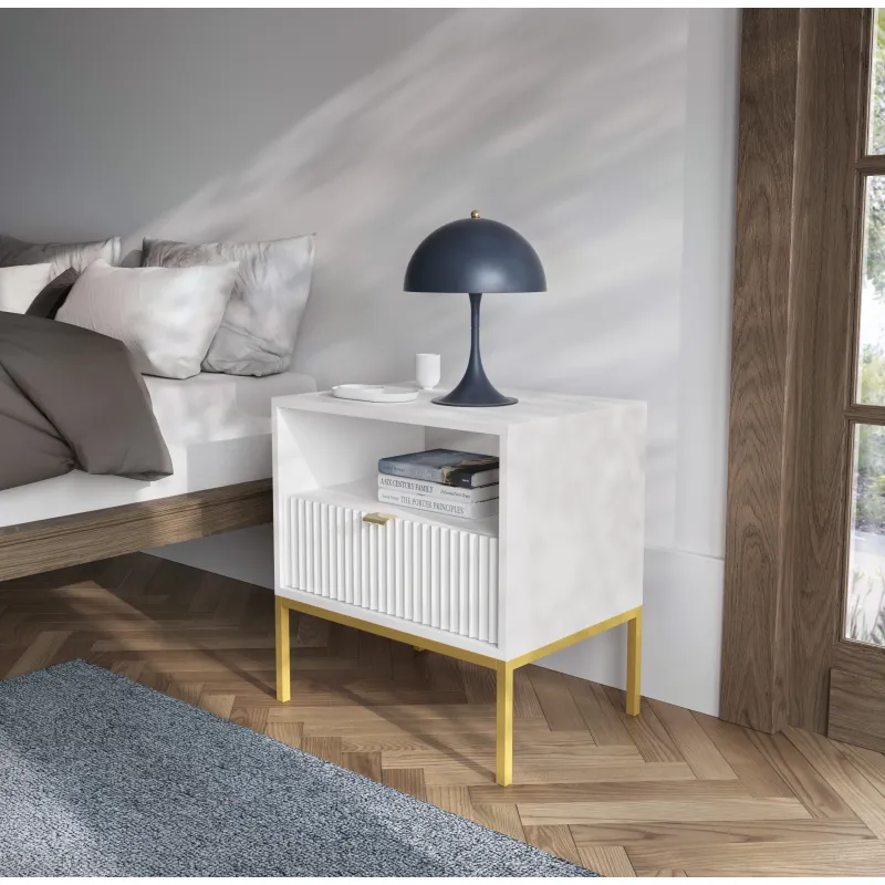 Stylowa szafka Nova do sypialni to doskonały wybór dla osób ceniących nowoczesny design i funkcjonalność. Wykonana w eleganckim białym kolorze, szafka doskonale wpisuje się w trendy współczesnego urządzania wnętrz. Jej unikatowy, ponadczasowy kształt oraz podłużne, ozdobne frezowanie na frontach nadają jej wyjątkowego charakteru, co z pewnością zwróci uwagę każdego gościa.