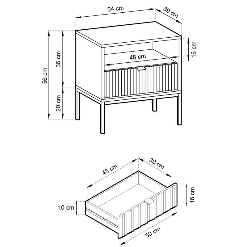 Szafka Nova jest niezwykle praktyczna, dzięki pojemnej szufladzie, która pozwala na przechowywanie drobnych akcesoriów, oraz otwartej półce, idealnej do eksponowania książek czy dekoracji. Stabilny metalowy stelaż zapewnia solidność i trwałość mebla, a uchwyty w kolorze złotym, wykonane z aluminium, dodają jej elegancji i wyjątkowego stylu.