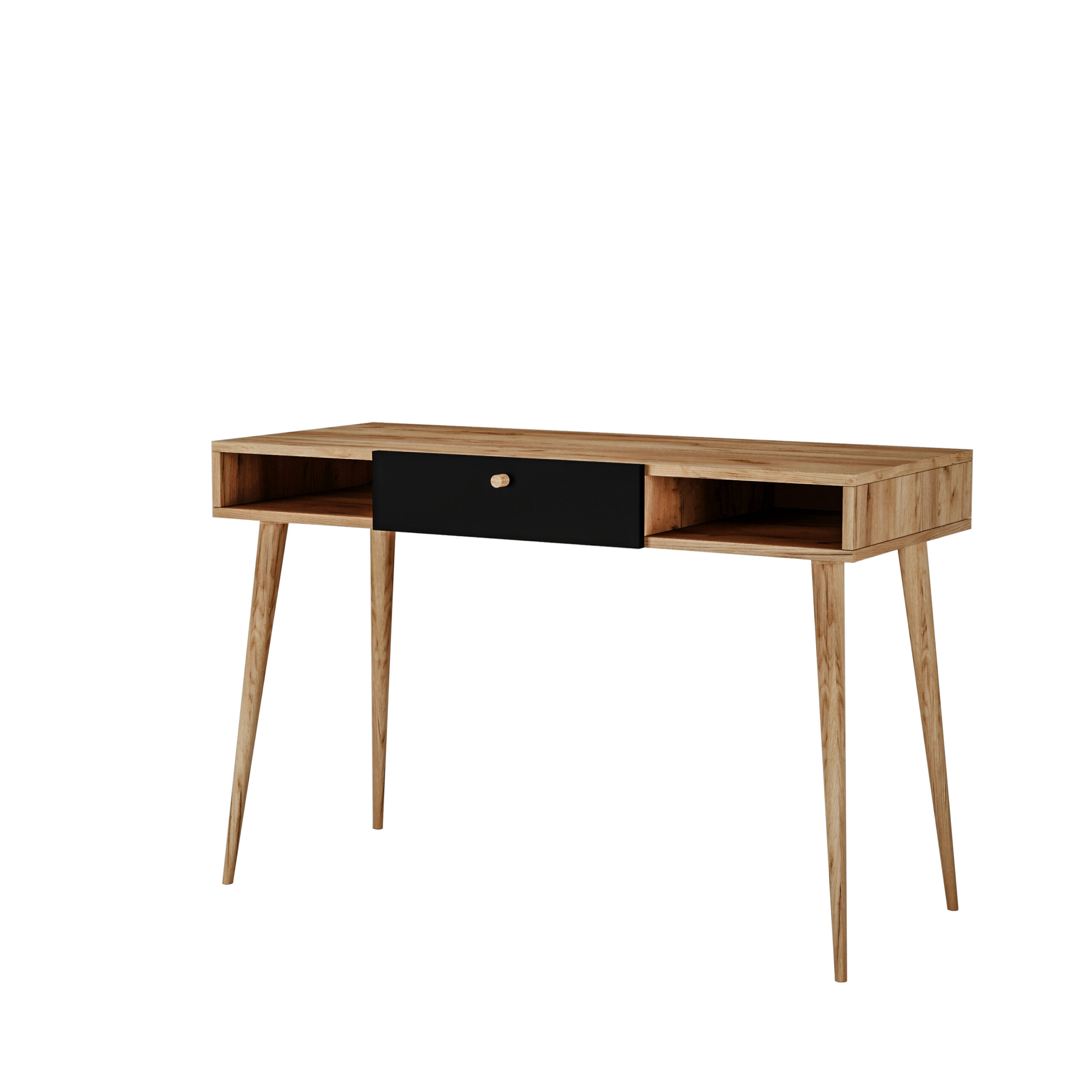 - W biurku znajdują się dwie wnęki oraz szuflada