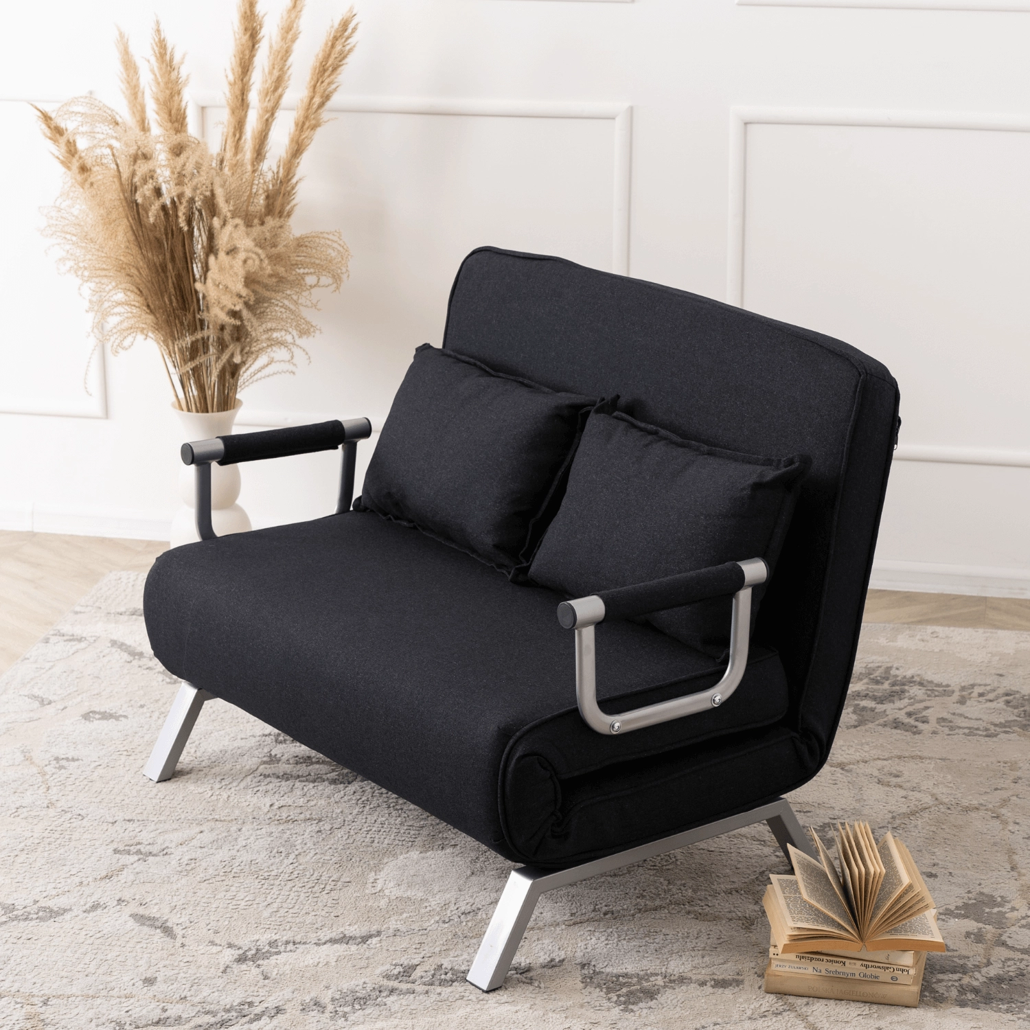 - Wygodne łóżko — po całkowitym rozłożeniu uzyskujesz przestrzeń do spania o wymiarach 185 x 100,5 cm, co sprawia, że fotel idealnie sprawdzi się jako miejsce noclegowe dla jednej lub dwóch osób w przypadku niespodziewanych gości.