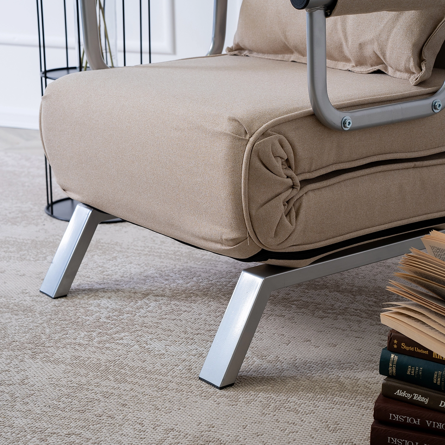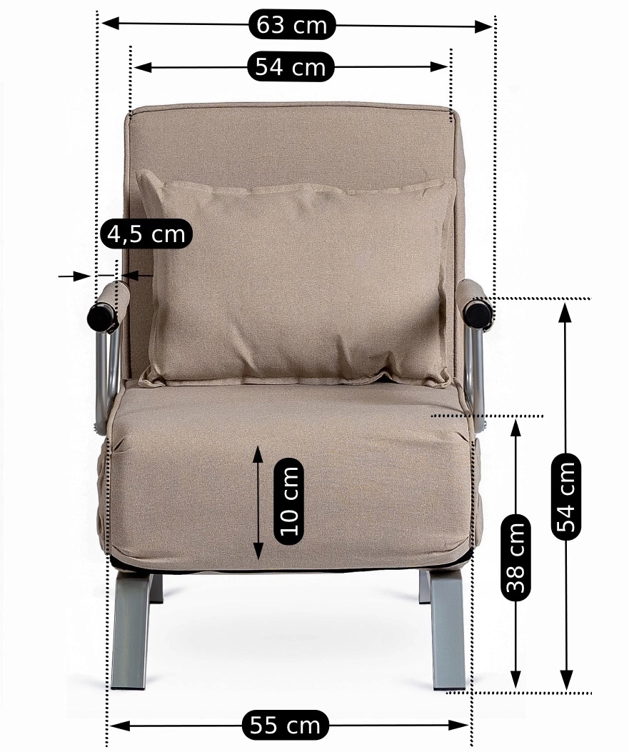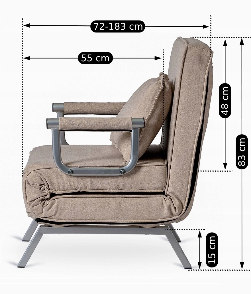 Gdy oparcie jest rozłożone na płasko, powstaje wygodne łóżko o wymiarach 183 x 55 cm, idealne dla jednej osoby, zapewniające komfortowy sen. Do fotela dołączono poduszkę, którą można umieścić pod głową lub w okolicy lędźwiowej, aby zapewnić dodatkowe wsparcie.