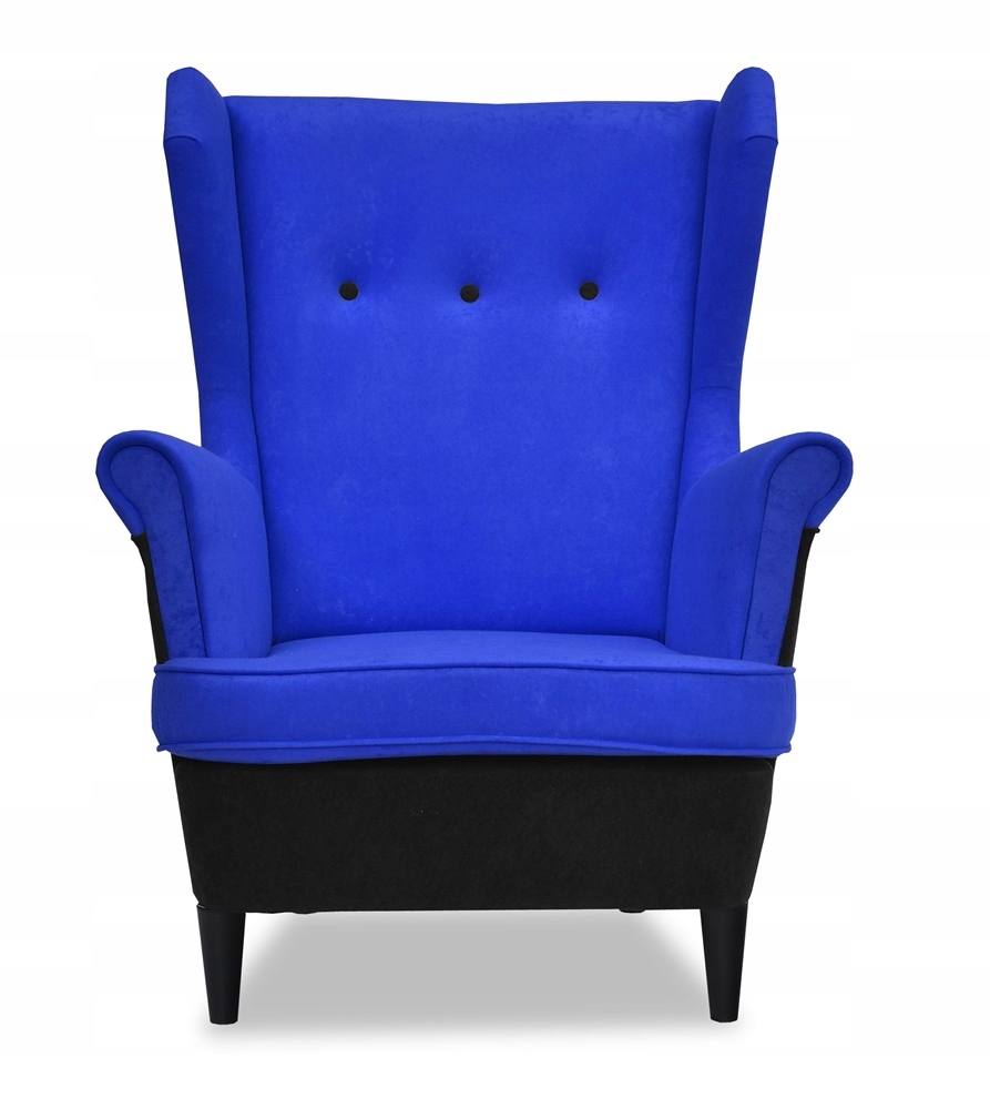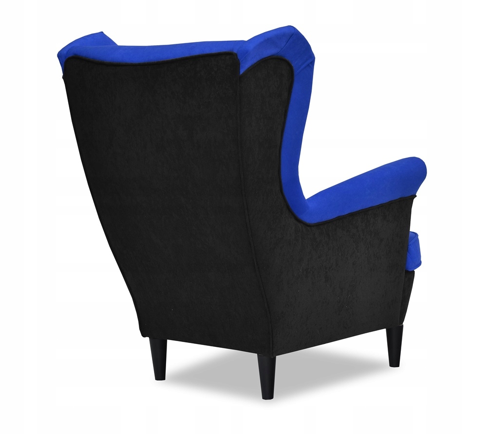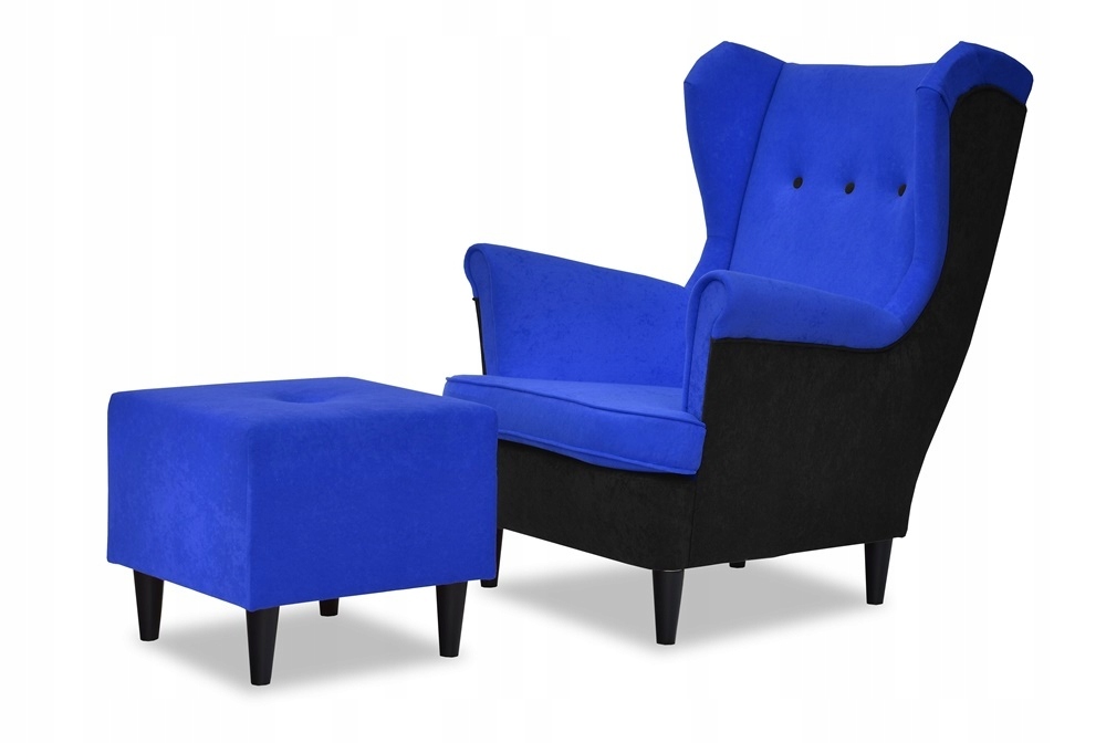 Fotel Uszak DUO w stylu skandynawskim z podnóżkiem – połączenie niebieskiego oraz czerni.