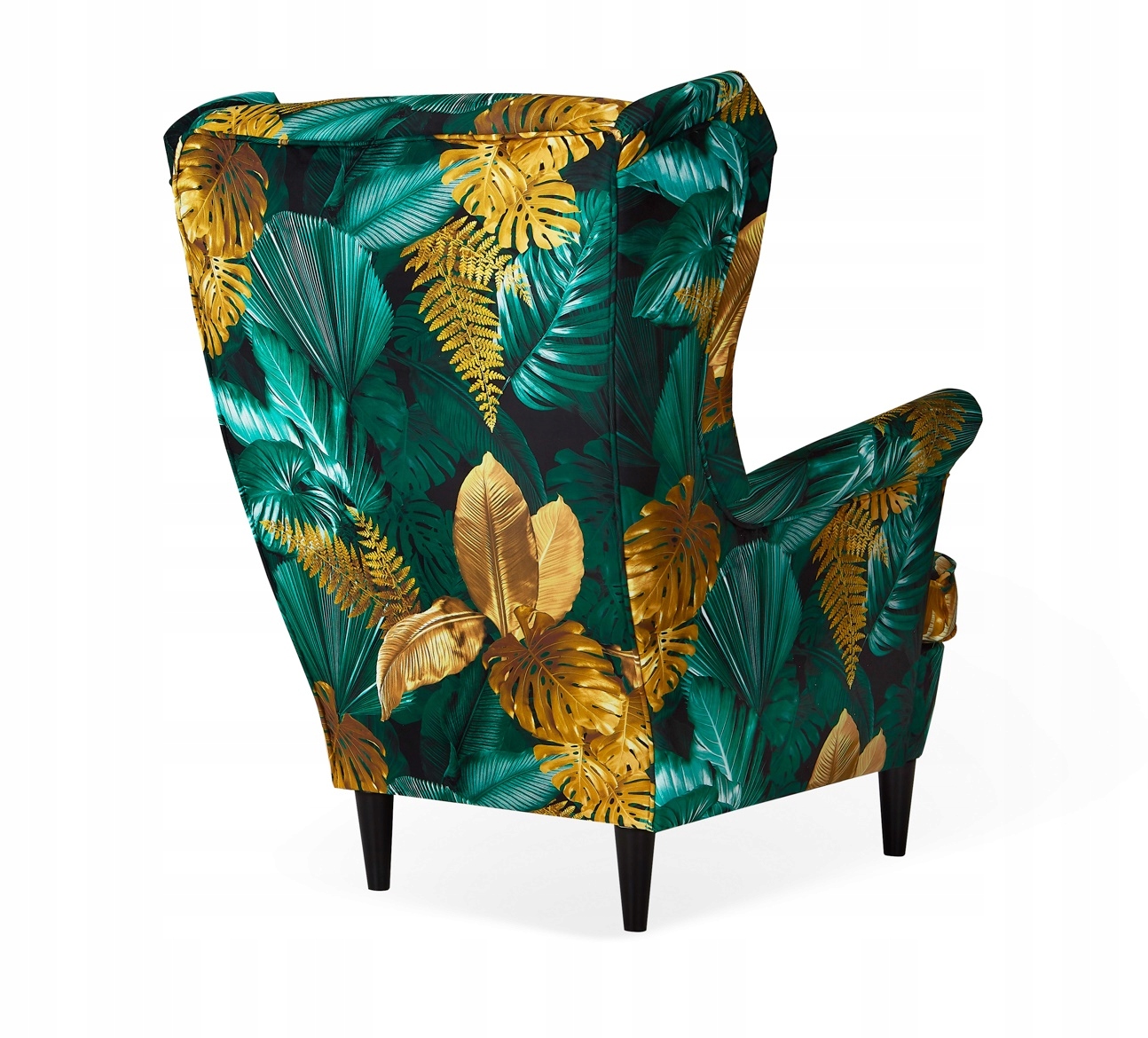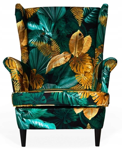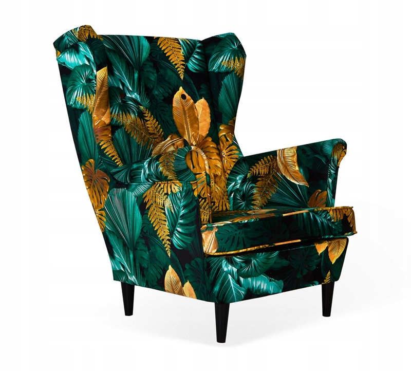 Fotel, którego dotyczy aukcja, wykonany został w tkaninie POLY 7. Elegancki motyw złotych liści połączony z butelkową zielenią. Dzięki niejednolitej grafice ewentualne zabrudzenia są mniej widoczne.
