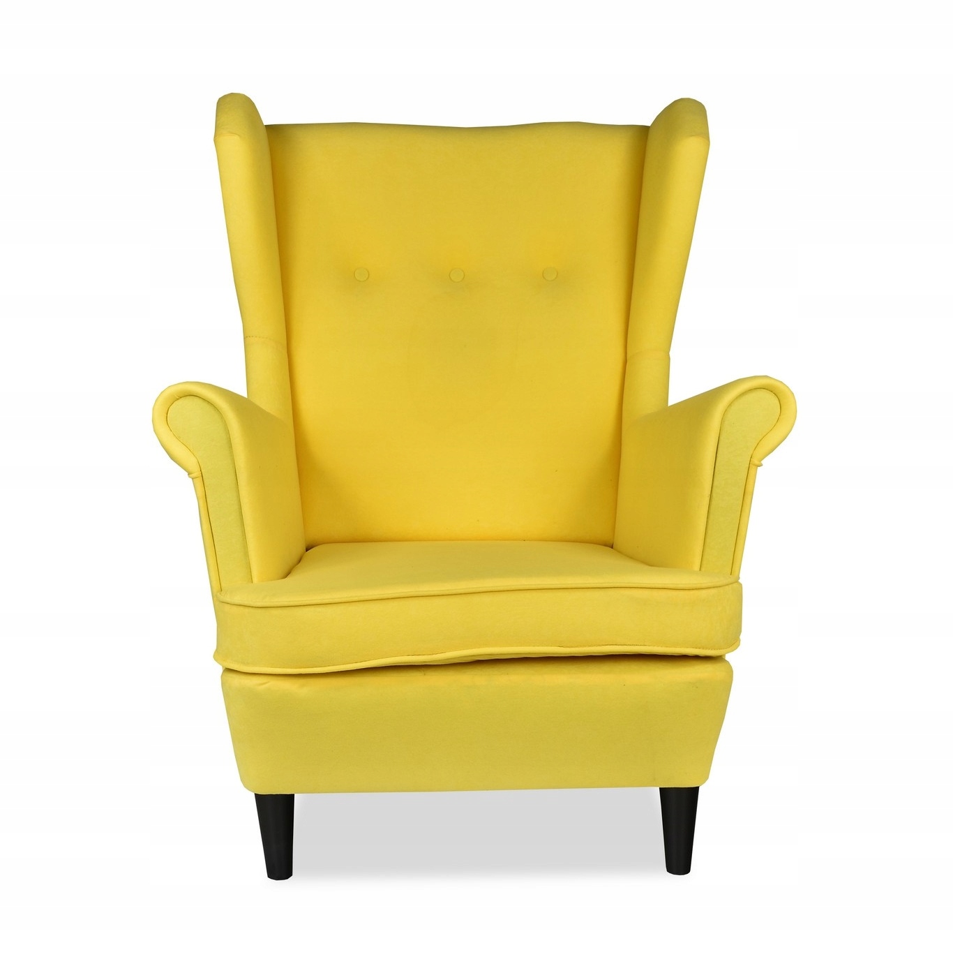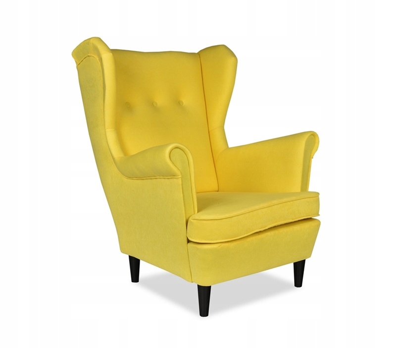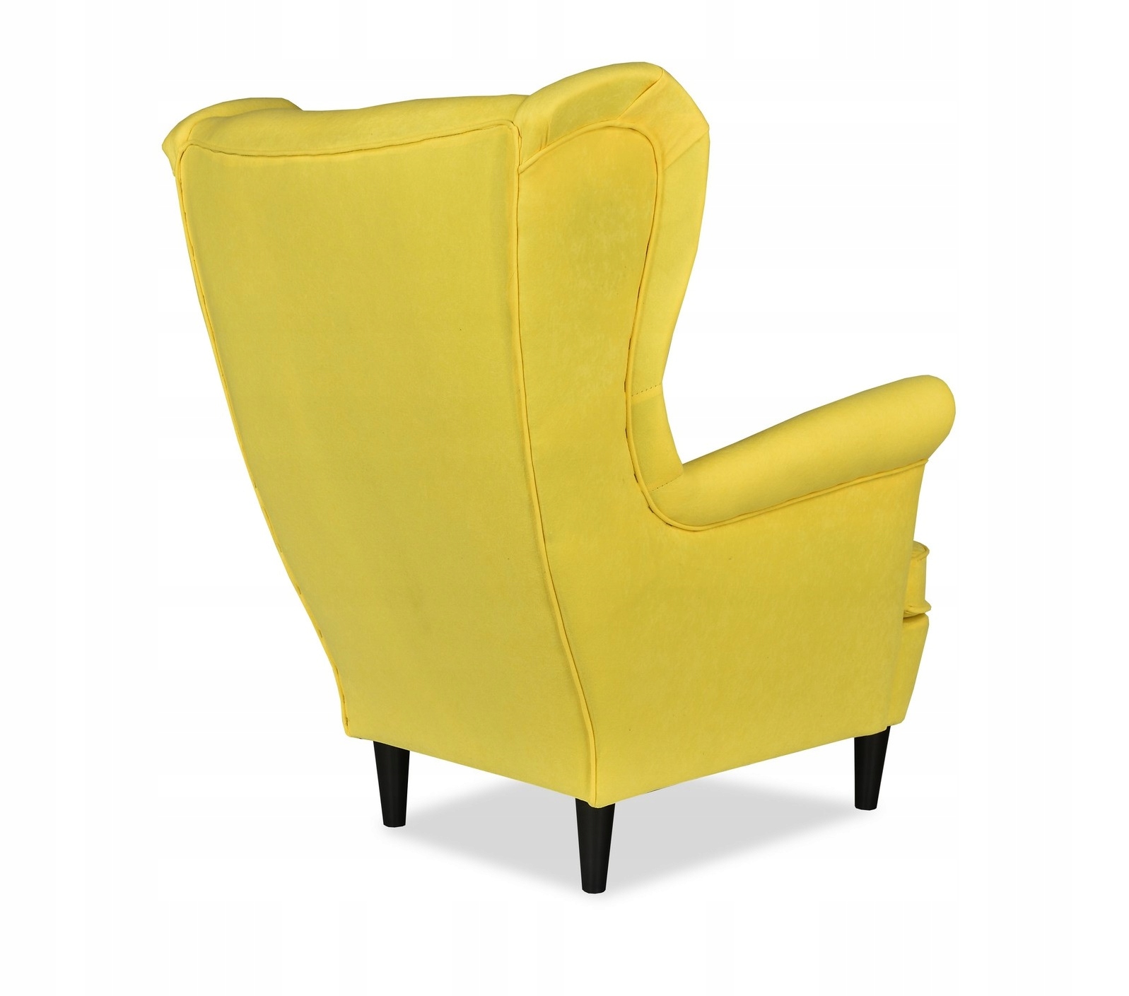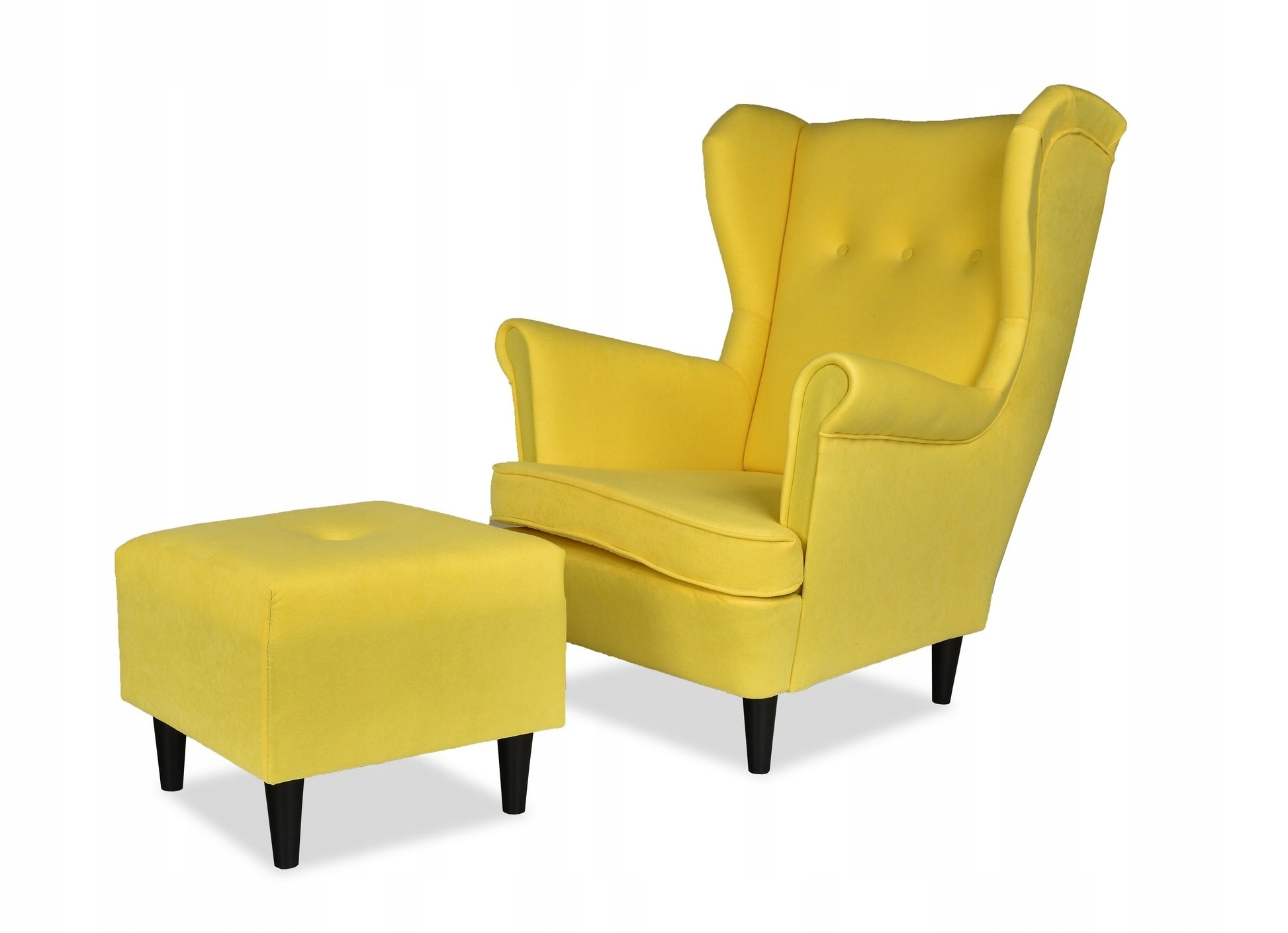 Fotel Uszak ARI w stylu skandynawskim z podnóżkiem – żółty welur.