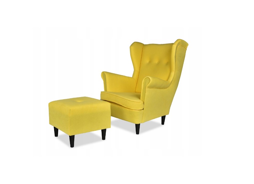 Fotel Uszak ARI w stylu skandynawskim z podnóżkiem – żółty welur.