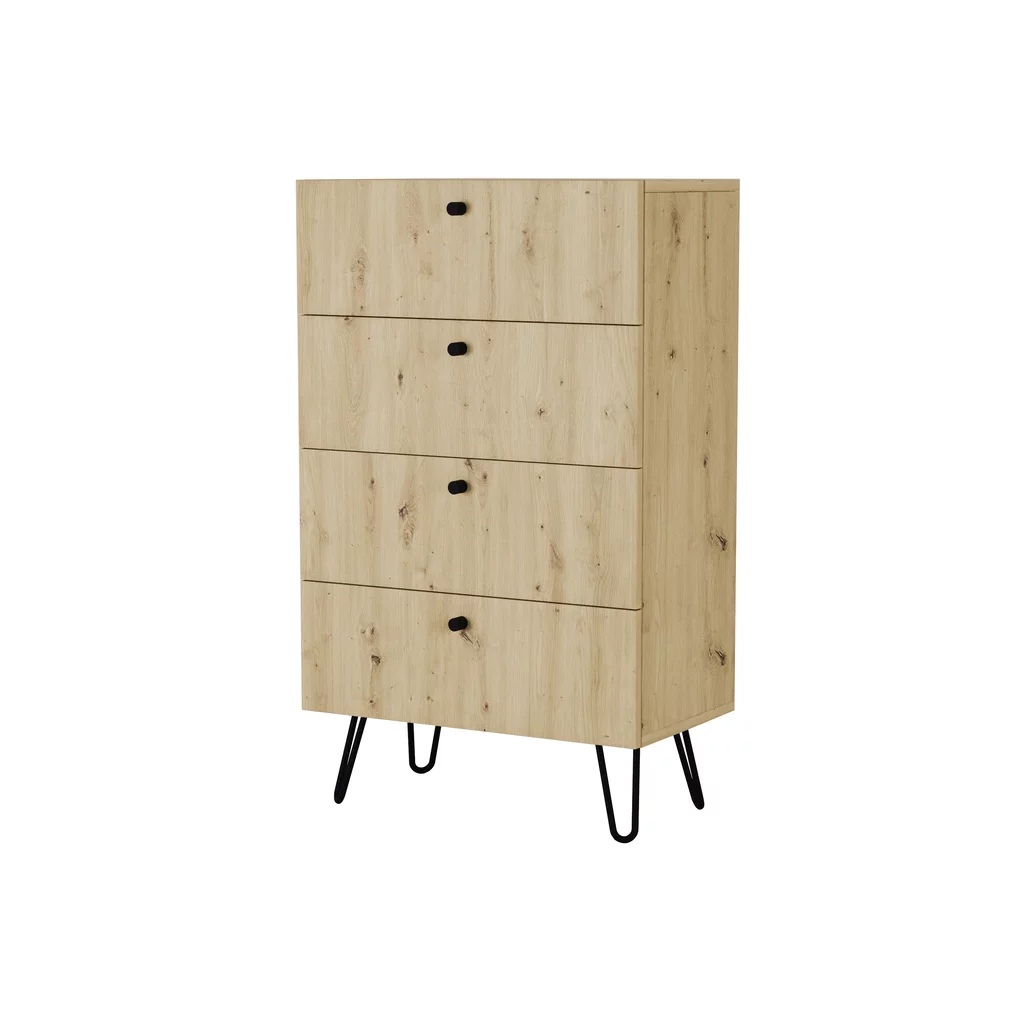 Komoda wyposażona jest w cztery pojemne szuflady na prowadnicach rolkowych, co umożliwia ich płynne i bezproblemowe użytkowanie. Dzięki temu praktycznemu rozwiązaniu można wygodnie przechowywać ubrania, dokumenty czy różne akcesoria, co z pewnością pomoże w utrzymaniu porządku w każdym pomieszczeniu.