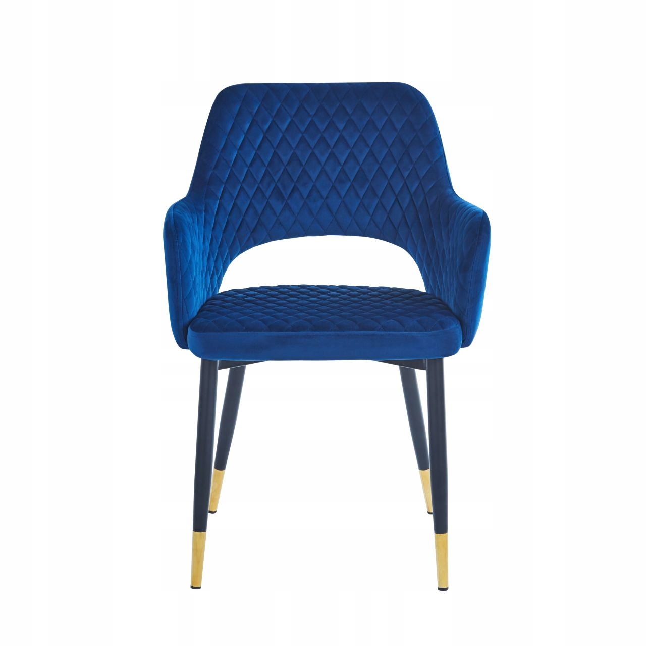 Nowoczesne krzesło o fotelowym kształcie z podłokietnikami. Tapicerowane niebieska, welurową tkaniną pikowaną z przodu siedziska, tył natomiast jest gładki. Nogi zostały wykonane ze stali malowanej w kolorze czarnym ze złotym, ozdobnym zakończeniem.