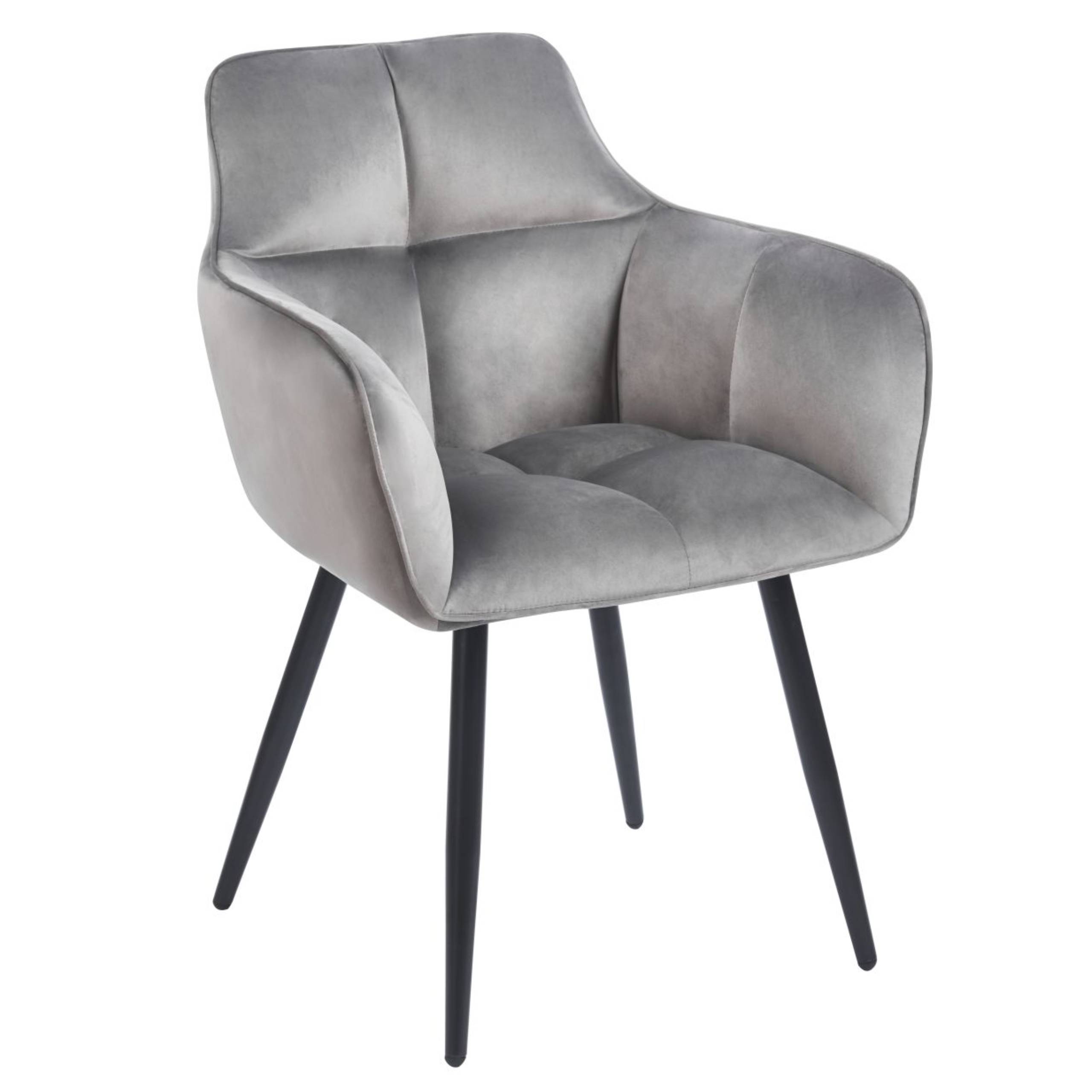 Krzesło tapicerowane jest aksamitną w dotyku tkaniną typu velvet w odcieniu szarości. Siedzisko jest wypełnione kilkucentymetrową warstwą miękkiej pianki, a uroku dodaje wyjątkowe pikowanie zdobiące przednią stronę oparcia. Subtelne nogi wykonane zostały ze stali malowanej w czarnym kolorze. Dodatkowo krzesło posiada podłokietniki.