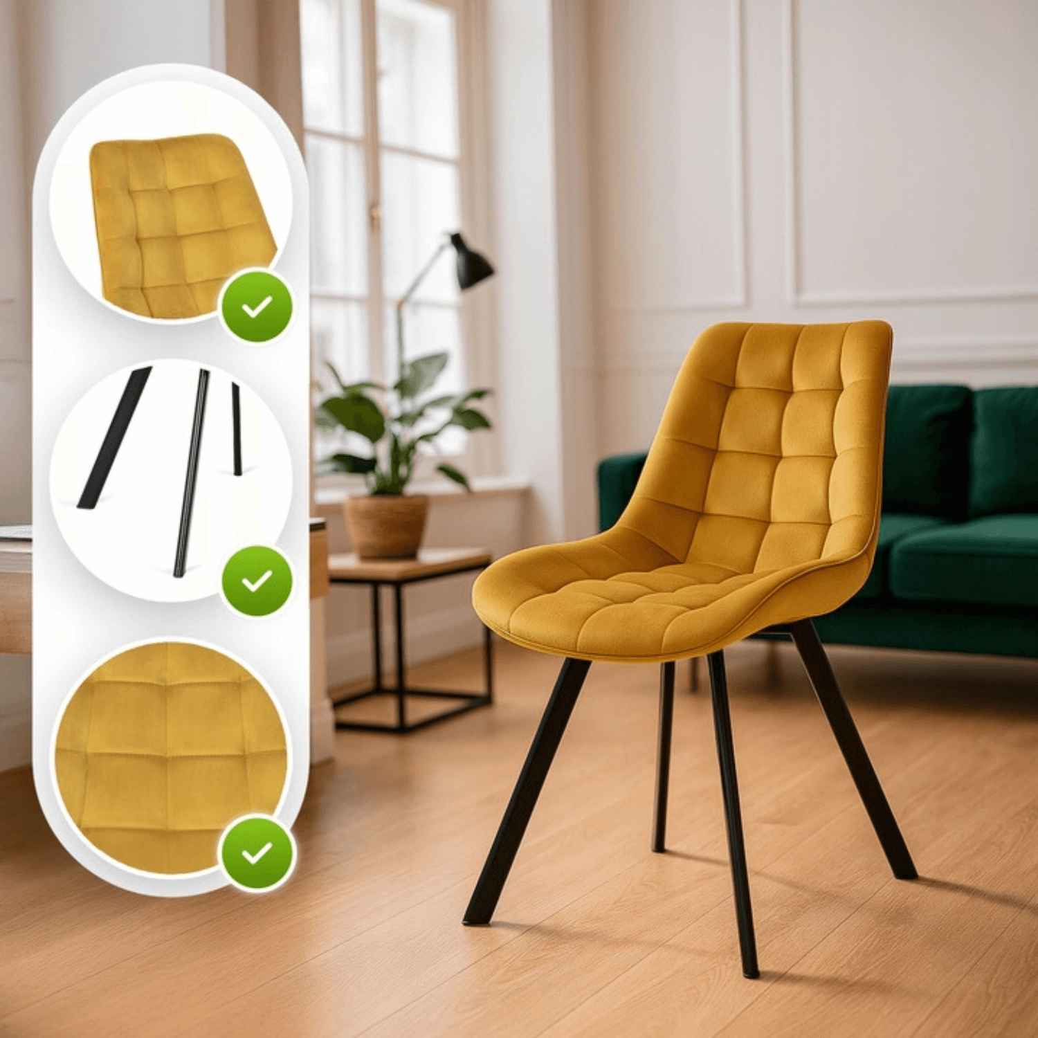 Oferujemy Krzesło Tapicerowane Kuchenne Welurowe Do Jadalni w nowoczesnym stylu loft. Krzesło RICK łączy w sobie elegancję i funkcjonalność, a jego musztardowy kolor dodaje wnętrzu wyjątkowego charakteru.