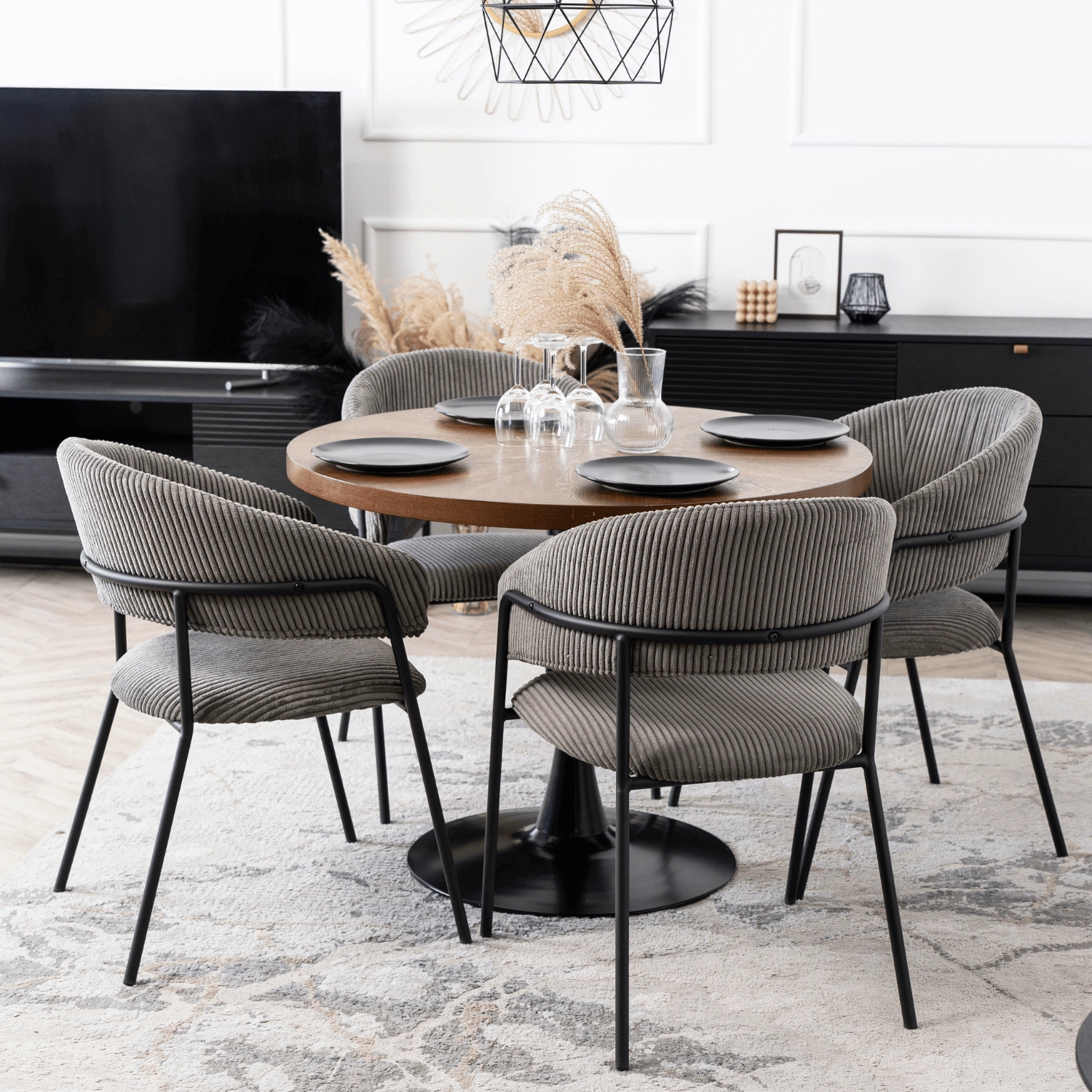 Krzesło TINKA w eleganckim odcieniu szarym, wykonane z wysokiej jakości sztruksu, to idealny wybór dla osób poszukujących połączenia stylu i komfortu. Doskonałe zarówno do użytku domowego, jak i w biurze, krzesło zapewnia wygodę przy długotrwałym siedzeniu.