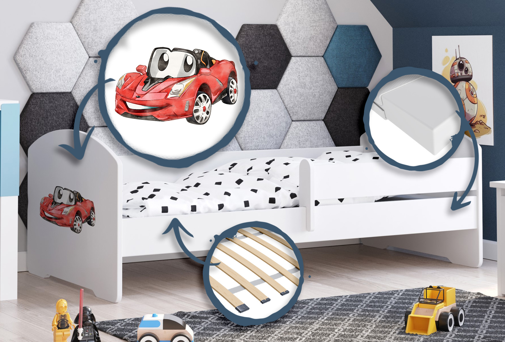 - Wersje w dwóch rozmiarach: 140×70 cm oraz 160×80 cm, co umożliwia dopasowanie do wieku i wzrostu dziecka oraz wielkości pokoju.