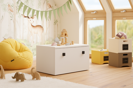 Minimalistyczne uchwyty dodają uroku oraz ułatwiają użytkowanie. Skrzynia INGA jest skrojona do potrzeb zarówno małych, jak i dużych. Oferuje pojemne miejsce do przechowywania, a pełny wysuw szuflady zapewnia wygodny dostęp do zawartości, wspierając rozwój dziecka i jego samodzielność.