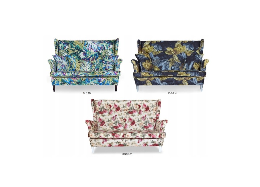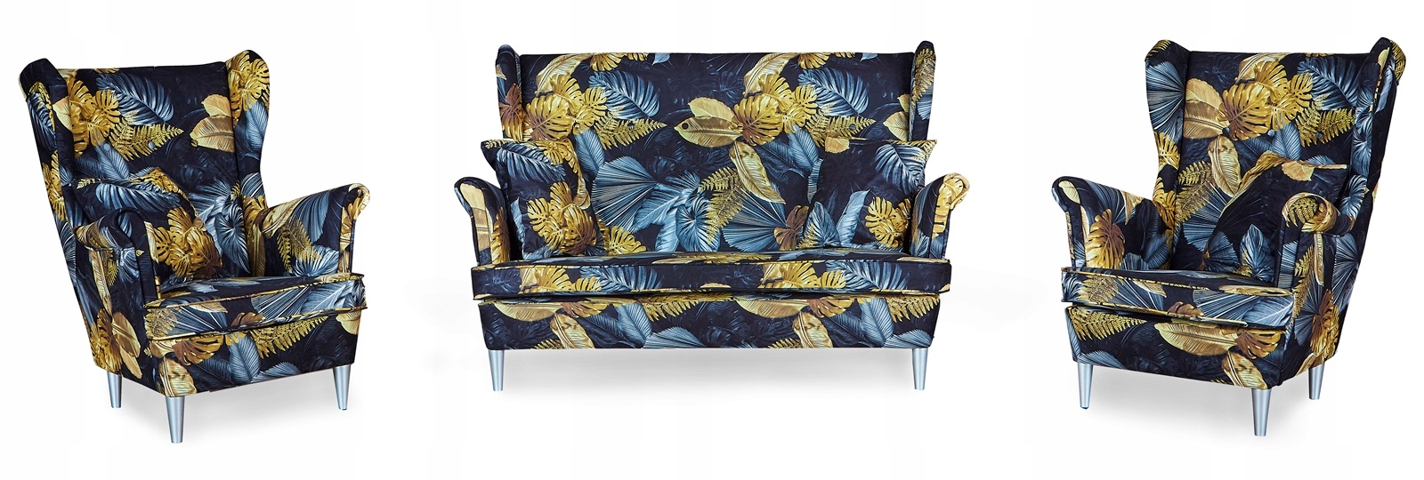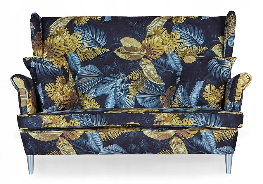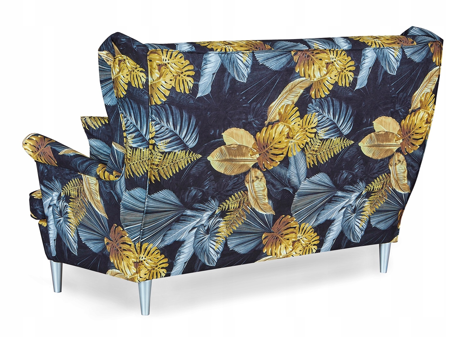 Sofa, której dotyczy aukcja, wykonana została w tkaninie POLY 3 – złote oraz szare liście monstery na czarnym tle. Elegancka propozycja dla każdego 🙂