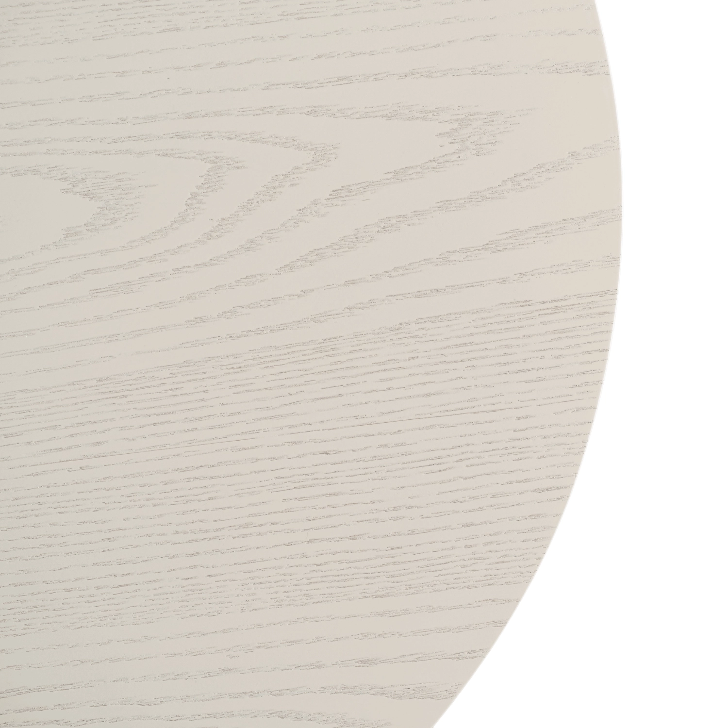Okrągły blat o średnicy 80 cm w modne, kaszmirowe wykończenie przyciąga wzrok. Jego kolor, przypominający ciepły beż z nutą szarości, wprowadza spokój i harmonię do każdego wnętrza. Dodatkowo, subtelny wzór drewna nadaje mu naturalnego charakteru, sprawiając, że jest zarówno elegancki, jak i stonowany.