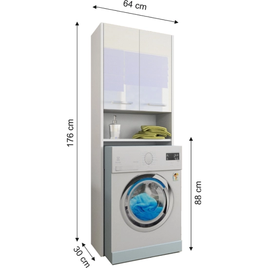 Słupek nad pralkę z serii LUNA POŁYSK o szerokości 64 jest meblem nowoczesnym, solidnym i dobrze wykonanym. Zostały użyte materiały najwyższej jakości, montaż za pomocą mimośrodów zapewnia atrakcyjny wygląd. Regulacja wysokości półki pozwala dopasować ich wysokość do różnych przedmiotów.