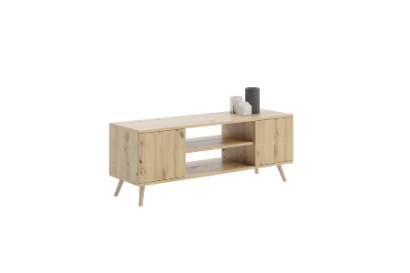 - Dwie otwarte półki – idealne do umiejscowienia urządzeń multimedialnych, takich jak odtwarzacze czy konsole do gier, zapewniając wygodne zorganizowanie przestrzeni.