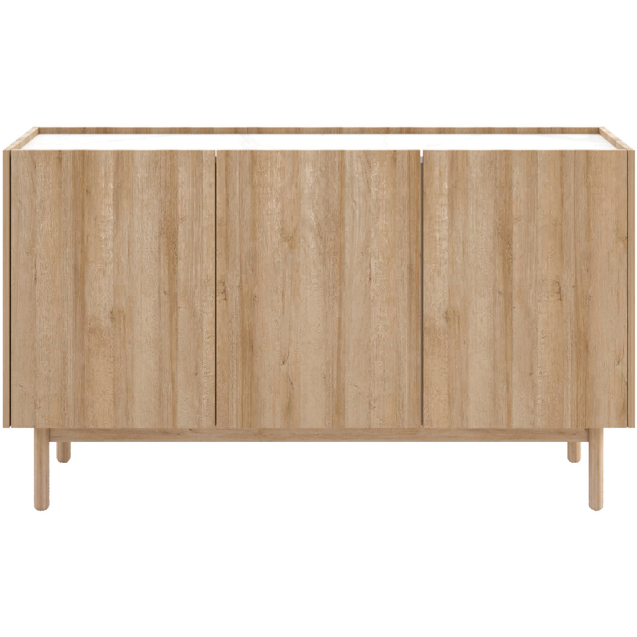 Komoda BOHO to elegancki mebel, który z pewnością wzbogaci każde wnętrze. Jej ciepły odcień dębu Riviera wprowadza do pomieszczenia przyjemną atmosferę, tworząc harmonijną przestrzeń do odpoczynku. Dzięki starannie zaprojektowanej konstrukcji, komoda oferuje przestronne wnętrze, które umożliwia efektywne organizowanie przestrzeni oraz przechowywanie najważniejszych przedmiotów w porządku. Obniżony blat wykończony w marmurowym stylu Bianco to doskonałe miejsce na eksponowanie dekoracji i roślin, jednocześnie zapewniając im stabilność i bezpieczeństwo. Wysokie nogi z litego drewna gwarantują nie tylko solidność, lecz także ułatwiają czyszczenie podłogi, co czyni ten mebel praktycznym wyborem do każdego pomieszczenia.