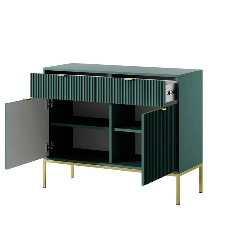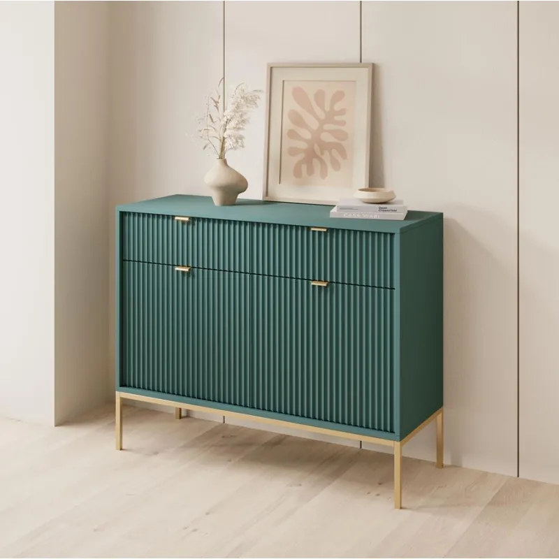 Zielona komoda Nova KSZ-104 ze złotym stelażem to połączenie minimalistycznego designu z praktyczną funkcjonalnością. Idealna do sypialni, przedpokoju lub salonu, zapewni porządek i stylowy wygląd każdego wnętrza. Prosta i elegancka forma z dekoracyjnym ryflowanym frontem to model, który z pewnością zadowoli miłośników nowoczesnego designu. Dzięki metalowej podstawie mebel zyskuje lekkość i nowoczesny charakter, a całość dopełniają stylowe uchwyty w kolorze złotym, które nadają wyjątkowego uroku.